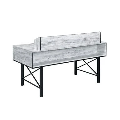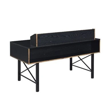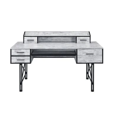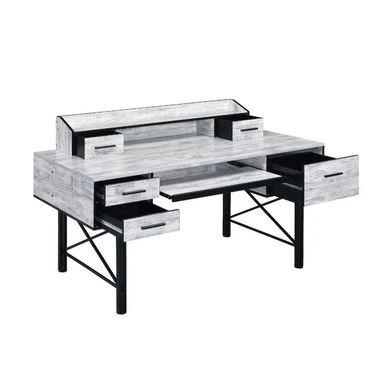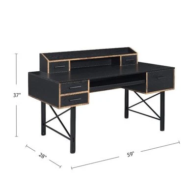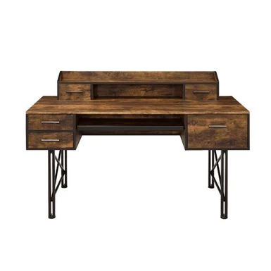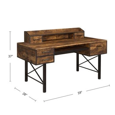 The desk features rustic casegood paired with a double pedestal metal base for a interesting contrast. There is a low open hutch with two small drawers that allows you place a computer screen and organize office suppies. Two shallow drawers and one deep drawer for documents or other files in different size while a keyboard tray for your computer equipments.