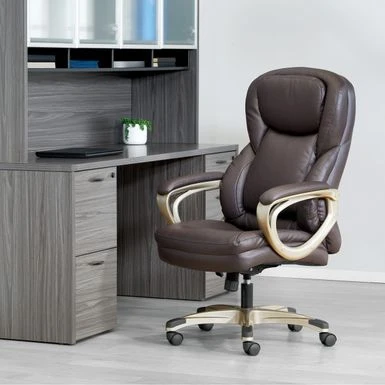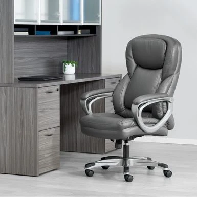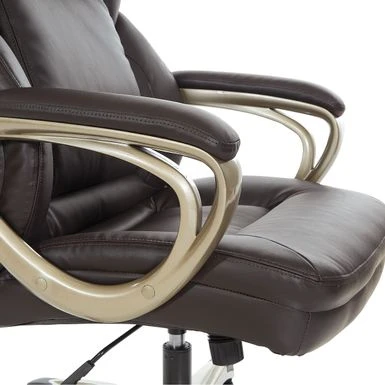 This Executive Bonded Leather Office Chair, complemented with a thick padded contoured seat and back with built-in lumbar support, is the perfect marriage of style and function. A heavy duty coated base with black end caps and dual wheel carpet casters add ease of mobility to this product. Chair comes complete with padded loop arms, locking tilt control with adjustable tilt tension and one touch pneumatic seat height adjustment. This chair is an instant ergonomic and aesthetic update to any office!