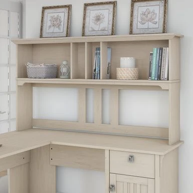 Curate a charming area for storage and display for books, photos, decorations and more with this inviting and elegant hutch. Two large open cubby areas on either side hold bigger items, and a pair of smaller spaces in the middle are perfect for storing important documents and work-in-progress. The hutch pairs with an L-shaped desk for perfect organization in any space.