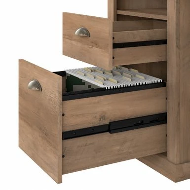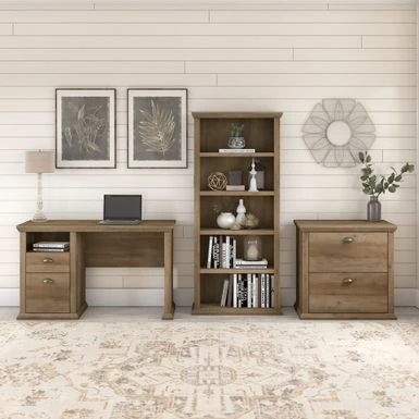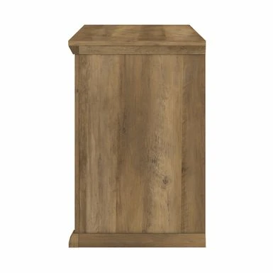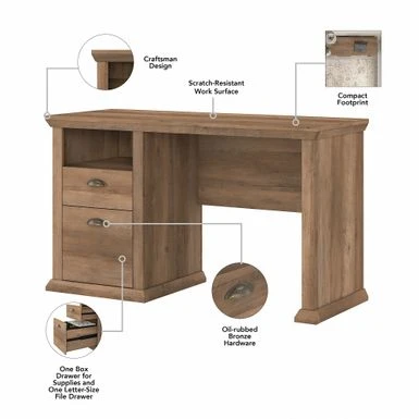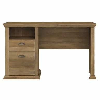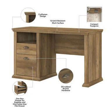 The Bush Furniture Yorktown Home Office Desk in Antique showcases a timeless design that enhances your workspace, providing ample storage and an attractive finish. With a durable laminate construction and beveled edge detailing, this desk features two convenient drawers for organizing office supplies and files, while the open cubby shelf below the desktop offers additional storage space. The antique cherry finish and oil-rubbed bronze drawer pulls add a touch of elegance, making it a versatile piece that easily complements any decor.