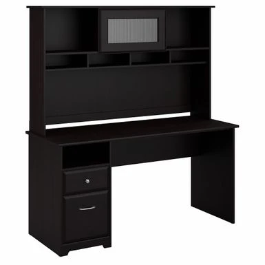 - Computer desk hutch combines open and closed shelving for flexible storage and display capacity