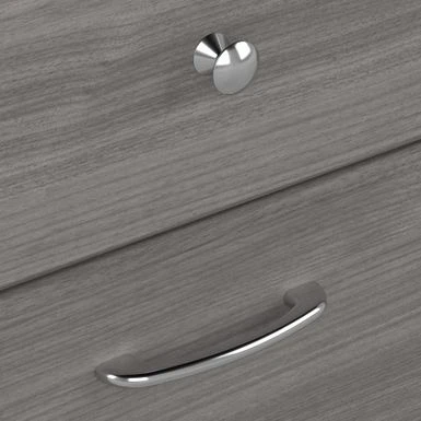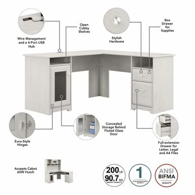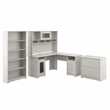 The Bush Furniture Cabot 60W L Shaped Computer Desk with Hutch, File Cabinet and Bookcase presents a home office solution with transitional style. Take advantage of the spacious L Shaped Desk surface to spread out with all the materials you need to power through your next project or assignment. The durable desktop supports up to 200 pounds and includes built-in wire management to keep cords and cables out of the way. Organize materials inside a storage cabinet with one adjustable shelf while using the file drawer and box drawer to keep important paperwork and office supplies close by. The Desk Hutch adds another closed compartment behind a fluted glass door along with right and left shelves for flexible storage and display. The lateral filing cabinet’s spacious drawers open on smooth full-extension ball bearing slides for an effortless reach to letter, legal, and A4-size documents. The Tall Bookcase includes three adjustable shelves for books and decorations of various sizes while two shelves are fixed for strength and stability. Stylish metal hardware complements your choice of several traditional and contemporary finish options for an appearance that works with your space. Wall attachment hardware is included for family-friendly safety in any home office. This corner desk with file cabinet and bookshelf set has been rigorously tested to meet or exceed ANSI/SOHO quality standards for safety and performance and is backed by the Bush Furniture 1 Year Manufacturer’s Warranty.