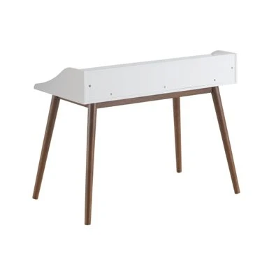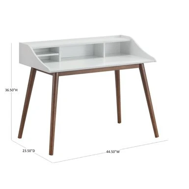 Add to your home with this sleek wood writing desk. This writing desk is made with Asian hardwood and MDF. The mid-century modern piece features a built-in hutch with a shelf and four storage compartment to give you plenty of storage options. Slim, tapered legs and gently contoured lines give an iconic silhouette to this practical piece. The white and walnut finish is perfect for any existing decor.