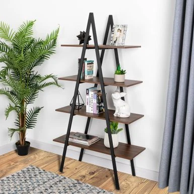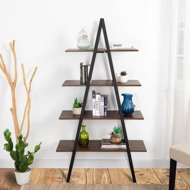 Glitzhome Casual 3-5 Tier Etagere Storage Bookcase Ladder Bookshelf – Walnut-5.4FT-A Shape