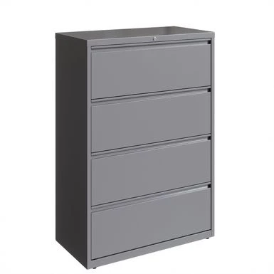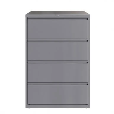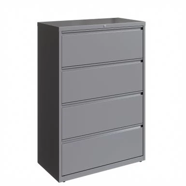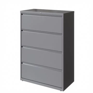 This 36 in. wide 4 drawer commercial grade lateral filing cabinet is designed for heavy duty use, yet looks great in any office. Precision ball-bearing suspension allows for quiet use in your busy office environment. This 36 in. wide 4 drawer commercial grade lateral filing cabinet is designed for heavy duty use, yet looks great in any office. Precision ball-bearing suspension allows for quiet use in your busy office environment. Fully assembled steel construction with reinforced base. Non-porous surface is easy to clean and sanitize. Interlock system prevents tipping by only allowing one drawer open at a time. Dual lock bars and core-removable lock come standard. Unit includes hang rails, magnetic label holders, and four adjustable leveling glides. Greenguard Gold certified for indoor air quality. Meets or exceeds ANSI/BIFMA standards. TAA compliant. Limited Lifetime Warranty.
