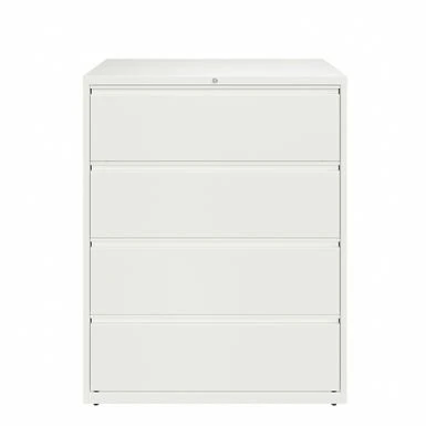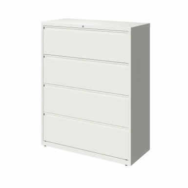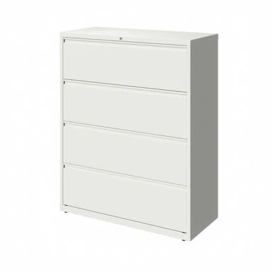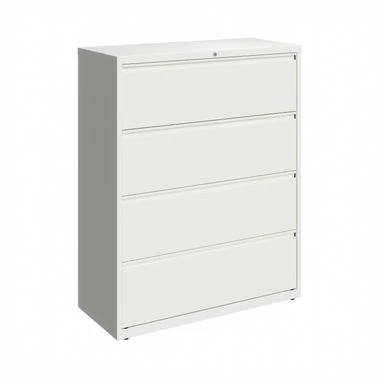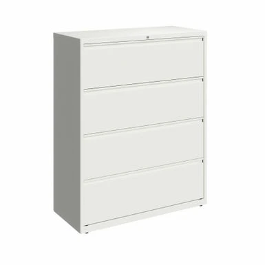 This 42 in. wide 4 drawer commercial grade lateral filing cabinet is designed for heavy duty use, yet looks great in any office. Precision ball-bearing suspension allows for quiet use in your busy office environment. This 42 in. wide 4 drawer commercial grade lateral filing cabinet is designed for heavy duty use, yet looks great in any office. Precision ball-bearing suspension allows for quiet use in your busy office environment. Fully assembled steel construction with reinforced base. Non-porous surface is easy to clean and sanitize. Interlock system prevents tipping by only allowing one drawer open at a time. Dual lock bars and core-removable lock come standard. Unit includes hang rails, magnetic label holders, and four adjustable leveling glides. Greenguard Gold certified for indoor air quality. Meets or exceeds ANSI/BIFMA standards. TAA compliant. Limited Lifetime Warranty.