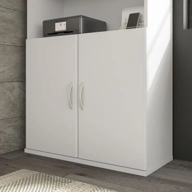 - Doors cover two bottom shelves; internal compartment includes one fixed shelf and one adjustable shelf