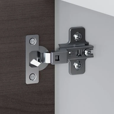 - Cabinet doors boast linear Brushed Satin Nickel handles and open on smooth Euro style hinges