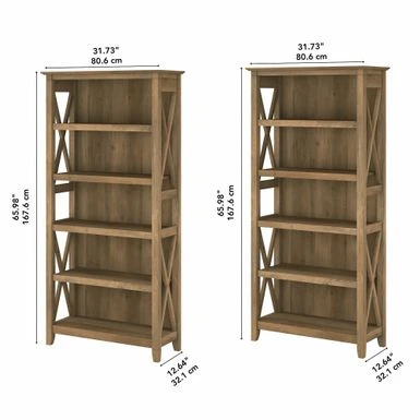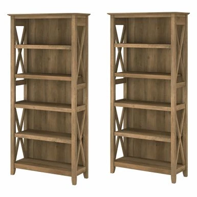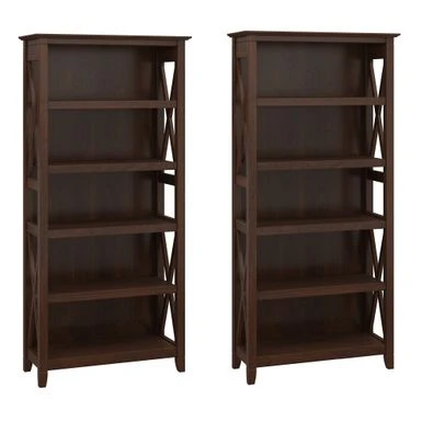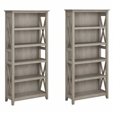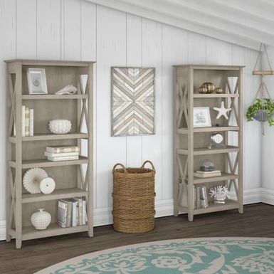 The Bush Furniture Key West Tall 5 Shelf Bookcase Set is a perfect way to show off your favorite artwork, photos, plants and more. These matching Bookcases each include three adjustable shelves to accommodate items of various sizes and two fixed shelves for stability. Each shelf supports up to 50 pounds so you can store your collection of paperback and hardcover books or display decorations with confidence. Place the tall bookshelf set side by side to create a storage wall or position them separately based on the needs of your space. Stylish touches include unique X pattern accents on the side panels as well as a sturdy and attractive post leg design. The 32W x 13D x 66H 5 tier bookshelves include wall attachment hardware for family-friendly safety and security in any home office or living room. A perfect choice for homes that embrace cottage, coastal and farmhouse decor, the Key West Collection includes a wide variety of coordinating items to expand your space as needed. Choose from several casual finishes to complement any room. These 5 Shelf Bookcases are tested to meet ANSI/SOHO quality standards for safety and performance and are backed by the Bush Furniture 1 Year Manufacturer’s Warranty.