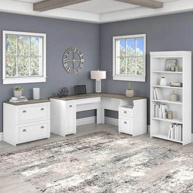 Makeover your home office space–or just your office space–with this fabulous arrangement: a three-piece set that includes a spacious, L-shaped desk; a tall, five-shelf bookcase, and a coordinating lateral file cabinet that’s ideal for storing a variety of documents. Keep your space both tidy and stylish, with a little help from this lovely set.
