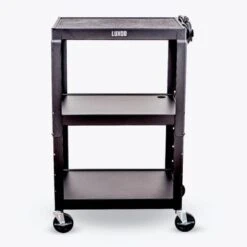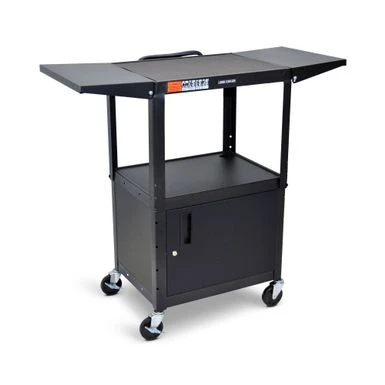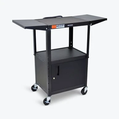 This popular multipurpose utility cart will securely store and transport your valuable electronic equipment from room to room. The steel construction and robotically welded shelves ensure long-lasting durability in tough environments. Textured mats and retaining lips keep shelf contents in place while the lockable steel cabinet securely stores your equipment. An adjustable top shelf can be set from 24″ to 42″-thick and includes a three-outlet electrical assembly for convenient power access, as well as two drop leaf side shelves to provide extra workspace when needed. This mobile cart is also easy to maneuver and can be quickly stabilized thanks to four 4″ full-swivel casters, two with locking brakes.