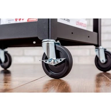 - Rolling cart with 4″ silent-roll, full-swivel ball bearing casters, two with locking brake
