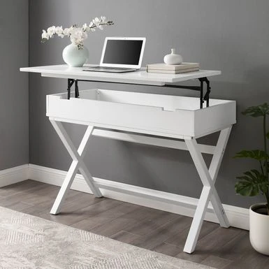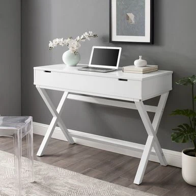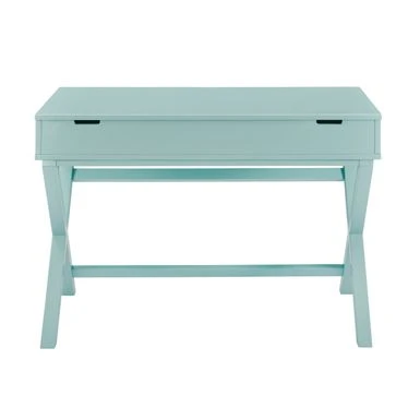 This campaign-style, lift top desk is the perfect option for any home, office, or dorm room. The simple design and x-frame legs will save you space, while still providing plenty of room for your books, laptop, tablet, or mail. The lift-top provides tons of additional storage space for things you’d like to keep tucked away. The smooth white finish will complement any decor color scheme. Available in white, turquoise, and