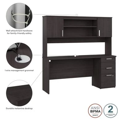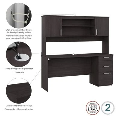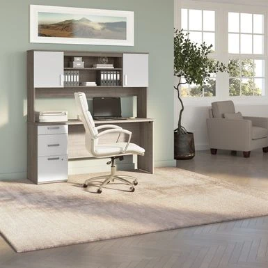 Set up a productive and organized workspace with the Bestar Ridgeley 65W Computer Desk with Hutch. High-quality materials ensure that your desk looks great for many years to come. Set up a productive and organized workspace with the Bestar Ridgeley 65W Computer Desk with Hutch. High-quality materials ensure that your desk looks great for many years to come. The durable melamine surface resists scratches and stains in any commercial or home office environment. Wall attachment hardware is included for family-friendly safety in your workspace. Organize various documents with confidence in the lockable file drawer that glides on smooth ball-bearing slides. You can use the box drawer and the small storage compartment to store office supplies such as pens, notebooks, and more. The work desk’s pedestal can be installed on either side for a left- or right-handed configuration. The desktop features a grommet to organize and conceal cables from all your electronics. The hutch provides additional storage space for all your essentials. Store work in progress on the two paper shelves and conceal unsightly items inside the two closed compartments. Create a private work corner in your home office thanks to the desk’s modesty panel. This computer desk with storage is tested to meet ANSI/BIFMA quality standards for safety and performance and is backed by the Bestar 2 Year Manufacturer’s Warranty. See the full Ridgeley Collection to create a cohesive office space with a file cabinet, a bookcase, and more (coordinating items sold separately).