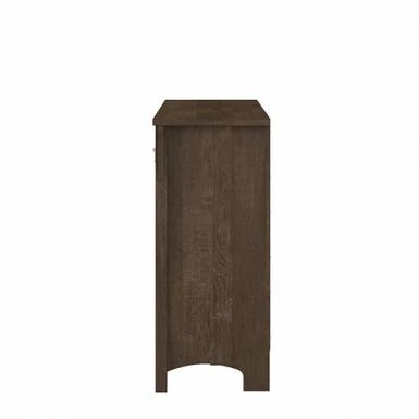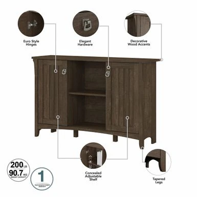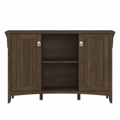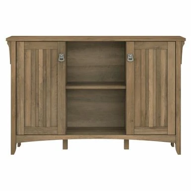 Add a touch of rustic charm to your living area or entryway with the Salinas Accent Storage Cabinet by Bush Furniture. The distressed MDF frame features a center cubby with a shelf and two cabinets with vertical detailing and adjustable inner shelving, providing ample storage space for your essentials. Choose from four finishes to complement your decor and enjoy the tapered legs and curved base rails that add a touch of elegance. Tested to meet ANSI/SOHO quality standards, this cabinet is not intended for use as a TV stand and requires assembly.