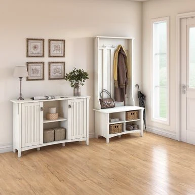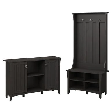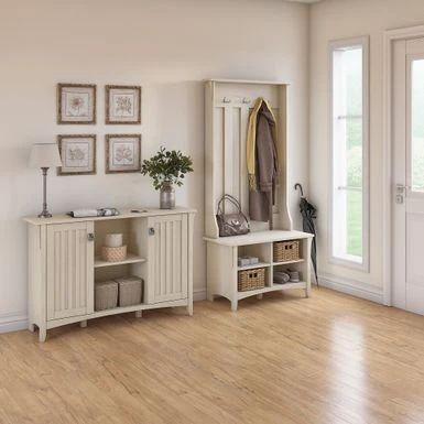 Create a warm, welcoming environment right inside your front door with this hall tree, shoe bench, and cabinet set. The timeless Mission style designs feature tapered legs, curved base rails, and eye-catching vertical lines to complement a wide variety of decor schemes. Have a seat on the bench while putting on and taking off your shoes, or use the spacious surface to set bags down while you get comfortable. Four cubby spaces with two adjustable shelves provide plenty of room to organize footwear, keeping your mudroom free of unnecessary clutter. The hall tree attaches to the top of the shoe bench and adds three double prong hooks for hanging coats, scarves and hats.