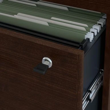 - Includes face front lock with interchangeable core in lower drawer that secures both the lower and upper drawer
