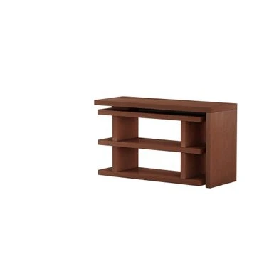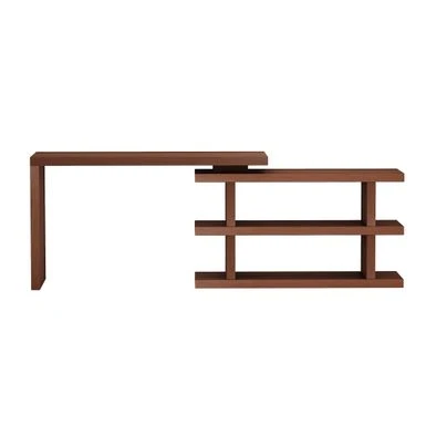 This home office desk features a turntable shelf that rotates completely to position left, right or closed, nesting the shelf area under the desk.