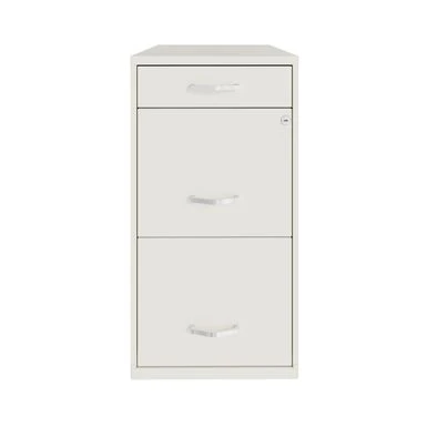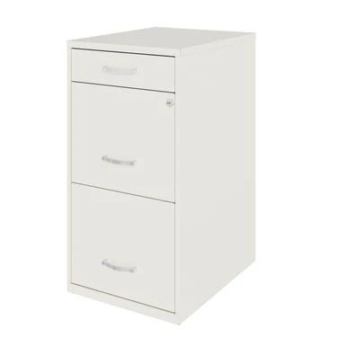 Store your files and office essentials in style with the Space Solutions Three Drawer Metal File Cabinet. Designed to fit under most work surfaces, this file cabinet features a sleek and efficient design that works well in smaller spaces. The two file drawers have high-sides that can accommodate letter-sized hanging file folders, while the top pencil drawer is perfect for storing other office essentials. With a patented glide suspension system, the drawers open and close smoothly with a three-quarter drawer extension. For added security, this file cabinet comes with a built-in lock for the top two drawers. Made with a painted steel surface, this file cabinet is easy to clean and disinfect. Bring organization and functionality to your home or office with this multifunctional file cabinet!