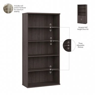 - Two shelves are fixed for stability while three can be adjusted to accommodate books and decorations of various sizes