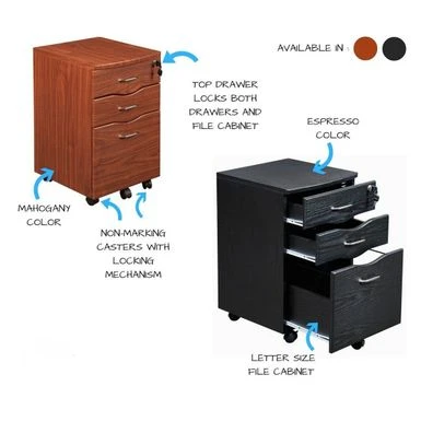 This Rolling Cabinet is stylish and keeps your accessories and documents organized. It features a top drawer with a locking mechanism that locks both the top drawer and lower file cabinet.